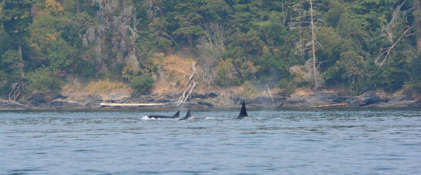 Our first whale encounter was with a pair of humpback whales cruising the South Pender Island shoreline and circling out into Boundary Pass. These whales are usually solitary in our waters, so to have a pair traveling together was kind of a cool sighting! We watched as these school-bus- sized whales surfaced and fluked, diving below the surface. After spending some time with the humpbacks, we headed for some other wildlife! We sped towards Java Rocks, finding a half dozen bald eagles sitting on the rocks and swooping through the skies. We also caught glimpses of harbor seals around the small chain of islets.