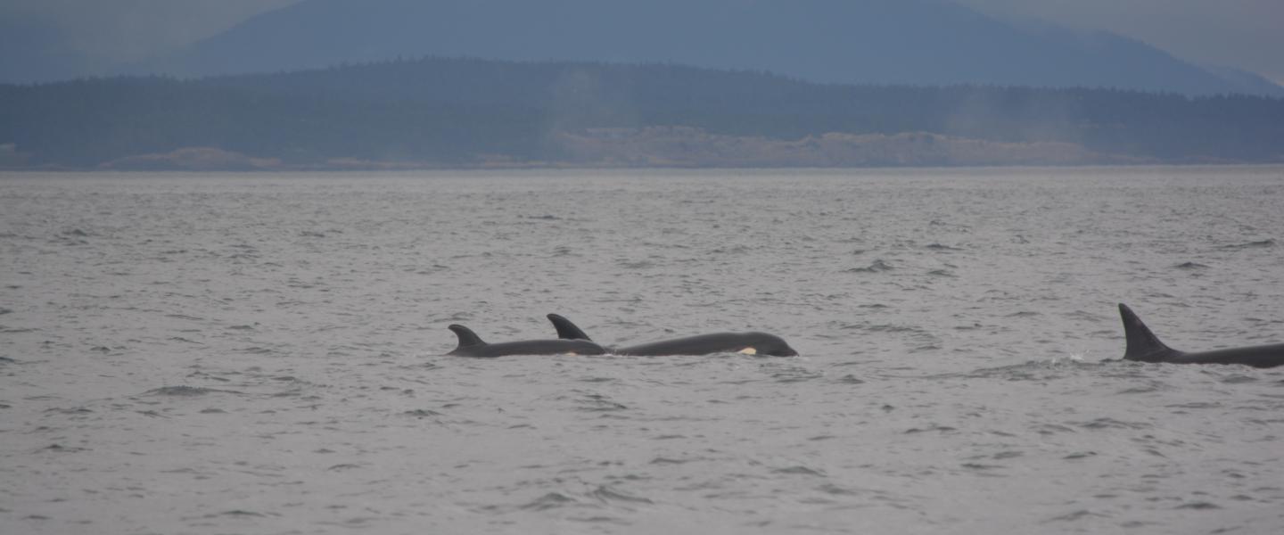 Sure enough, we had only to drive for about 10-15 minutes before we saw our first beautiful dorsal fin slicing through the surface! It appeared that we were with the T100's, along with a couple of other adult males. The pod was moving slowly southeast, gracing the surface with their beautiful breaths before submerging again. As always, it was hypnotic to watch their movements and interactions with each other. Naturalist Erick and I chatted with our wonderful passengers about the amazing biology of these animals, and we were able to hang out with them for a good amount of time before we had to head back towards the harbor. It was a beautiful experience for all of us onboard.