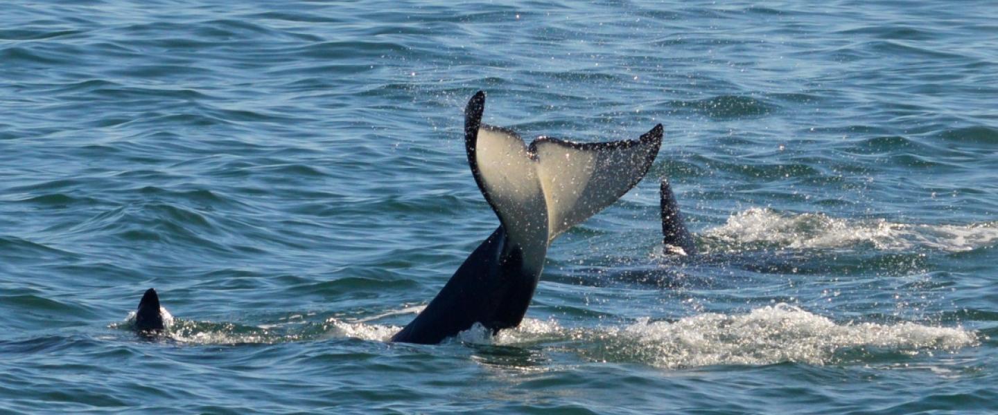 Then we watched the little baby orca splashing and playing in the water. Just like with our infants, they are especially playful! We even saw his little tail fin slapping the water making little spashes. Potentially these two pods were having a playdate! Because we spotted another tiny whale that was around the same age, swimming within the other pod.