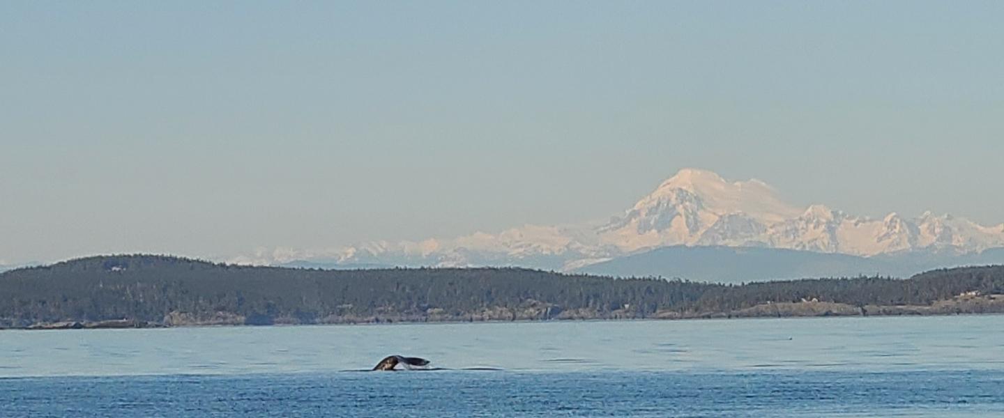As we watched, we learned it was a gray whale! It is super rare to see gray whales in this region, so it was definitely a special sight to see! Its beautiful splotchy back burst through the surface and the whale hardly seemed to move at all and spent a lot of time at the surface! He seemed to enjoy this one specific spot of water as he dove down repeatedly in the same area. On his deep dives he showed us his huge fluke! A few people got really good photos of the tail and Mt. Baker!