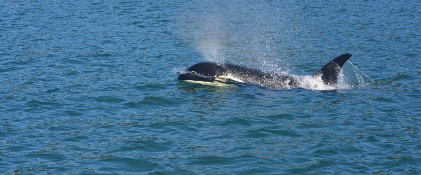 And patience sure pays off! About 20 minutes later, big ole Mike came cruising along, trailing behind the rest of his family. Slick and her new calf, Scarlet, were seen playing off in the distance, and we saw some adorable calf breaches, probably from the show-off Sonic. It was turning into social hour for this family, or at least for the young ones! The adults seemed quite busy foraging, while the calves kept playing, probably to the dismay of their mothers. After all, we as humans don't really like it when their kids are running around the grocery store creating mayhem, so it only makes sense that mother orcas probably get irritated with their offspring at times!