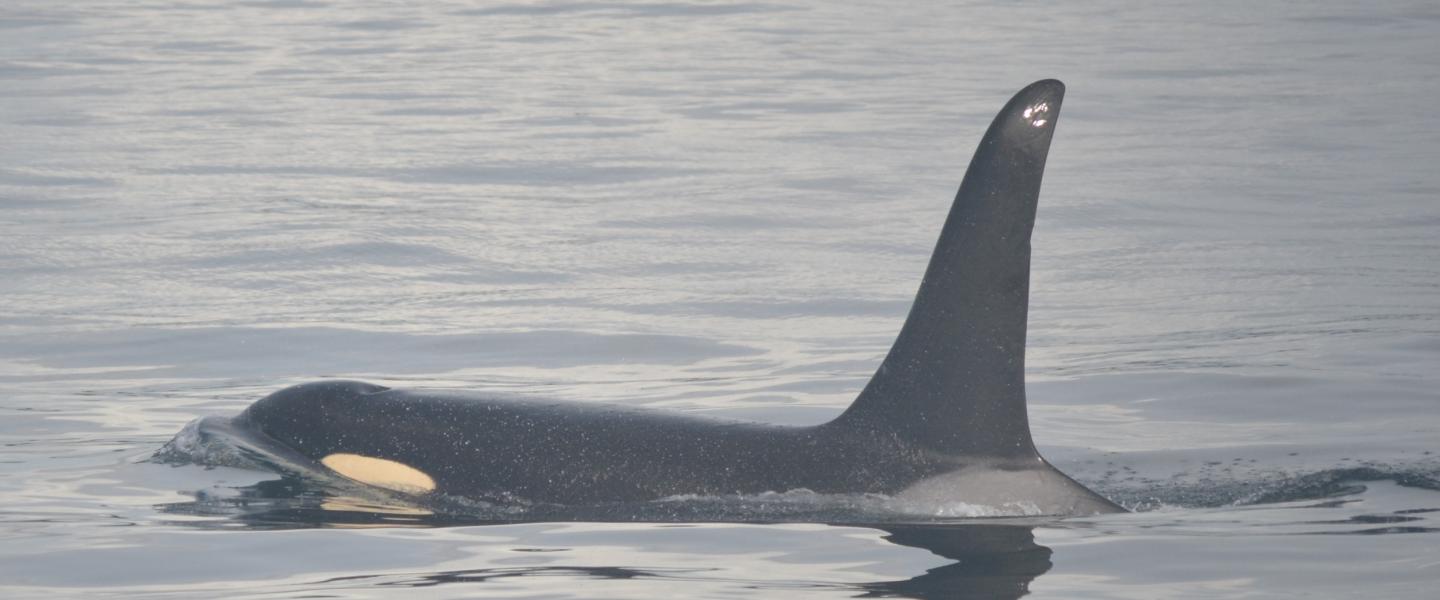 Transients, also known as Bigg’s killer whales, are marine mammal eaters. Their diet consists primarily of harbor seals (60% of their diets), but they will also eat sea lions, porpoises, dolphins, and whales. The transients that we see here in the Salish Sea are considered to be a distinct population, known to hang out primarily in the waters off of British Columbia, Washington, and Oregon, but they have also been seen off the coast of California and even up in Alaska. There are also populations known to reside primary off the coasts of Mexico and California as well as a population off the coast of Alaska. Transients tend to live in small matriarchal groupings of 4-6 individuals, but, unlike the Residents, it is not totally unusual to see an individual (usually adult male) traveling by himself. Behaviorally I describe these whales as stealthy; they are hunting very intelligent mammals so it is very rare to see Transients engaging in surface activity (unless after a kill) or long loud vocalizations as it gives away their position to potential prey. Physically, they are a large bodied ecotype with, closed, all-grey saddlepatches, and exaggeratedly pointed dorsal fins. When distinguishing between Residents and Transients I also tend to look at their eyepatch marking, the white spot on their heads, as an indicator of ecotypes. Transients tend to lift their heads further out of the water with each exhale to reduce underwater sound, revealing a slightly different tilt to the marking. Transients also are apt to have more scarring on their bodies due to the aggressive nature of their prey.