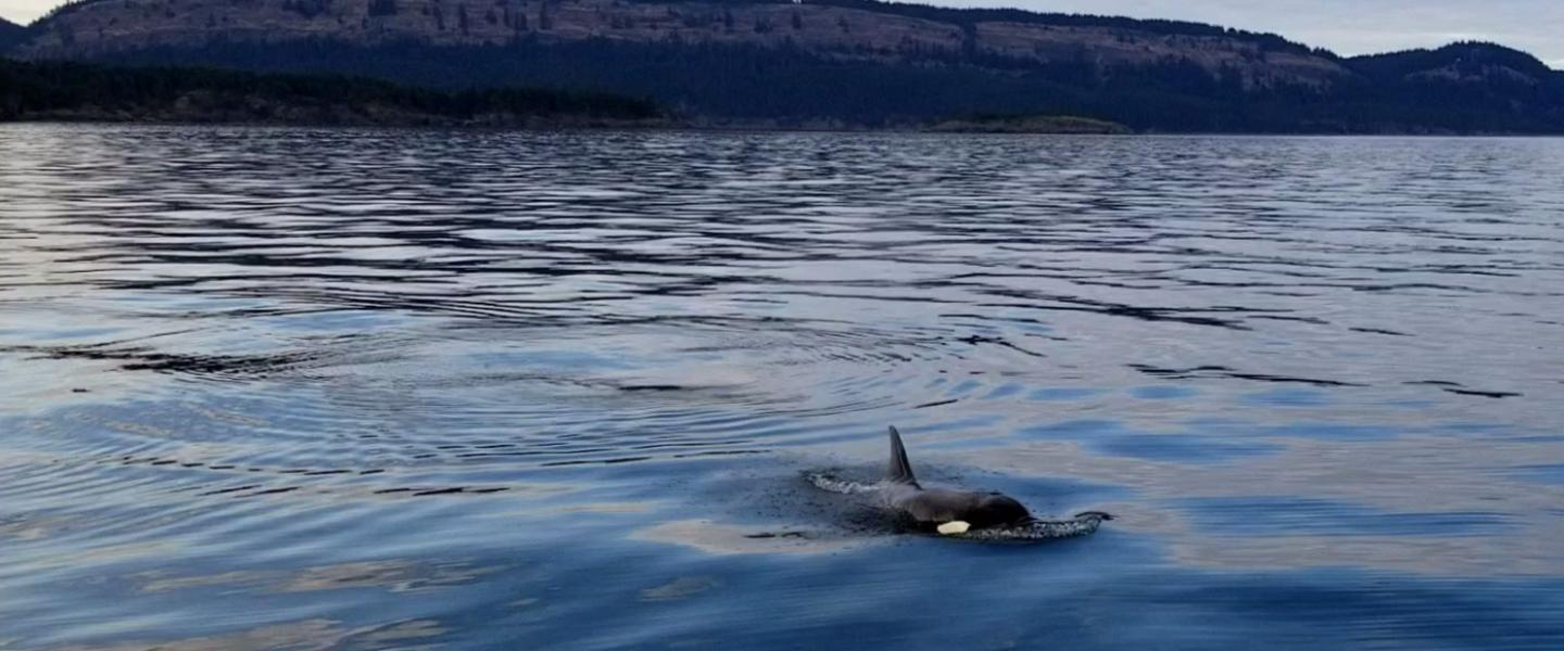 The five orcas slowly swam out of Plumper Sound and down into Boundary Pass where they headed west slightly before taking a break to rest and socialize. We floated with our engine off, something we like to do as often as we can, and watched as the three adults in the group spread out and appeared to just be having some “me-time” while the two young siblings played off by themselves.