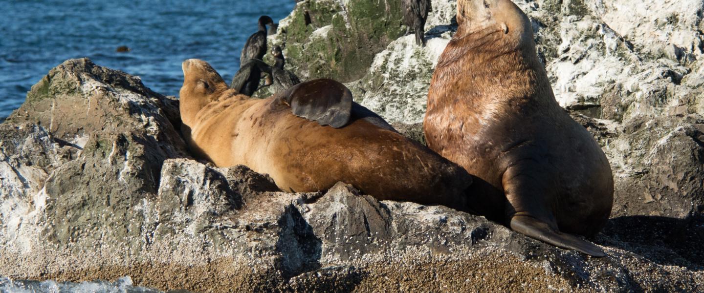 We stopped to see Steller sea lions climbing around shear rocks jutting out of the water as massive waves crashed all around us and splashed onto the island. The sea lions did not seem to mind the chaos.