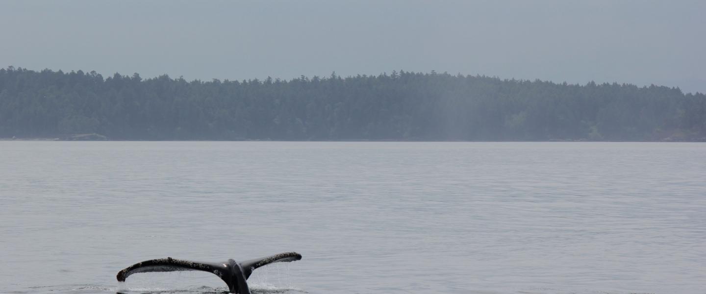 After a great stop at the lighthouse we pushed north into the Strait to encounter two well-known local humpback whales BCY0160 “Heather” and BCY0458 “Raptor.” We can identify humpback whales by their unique tail flukes and dorsal fin shapes, and without ever touching them or attaching tracking tags researchers all over the North Pacific can keep track of their movements. We got to witness several fluke-up dives and paired surfacing from the two whales.