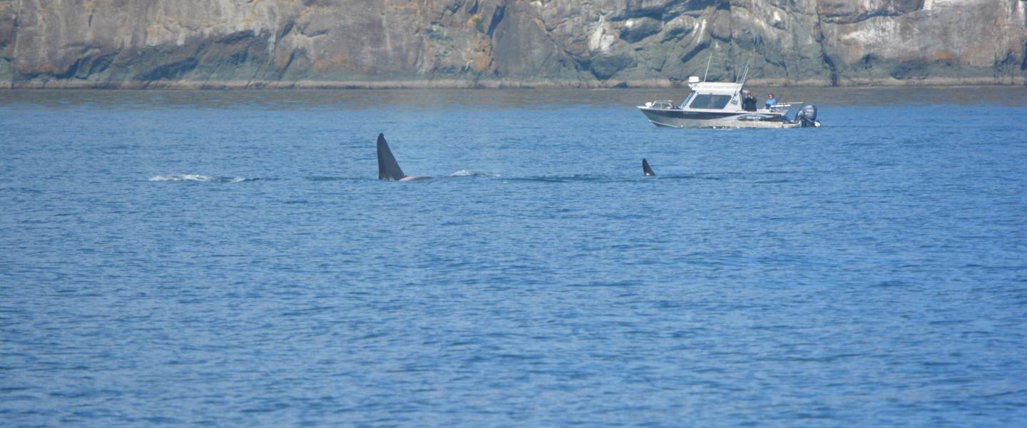 Through San Juan Channel we went, basking in beautiful views of San Juan Island, Shaw, Orcas, Spieden, John’s, and Stuart (along with many, many others!). We had a chance to cruise through John’s Pass before moving towards Turn Point, where we came around the most northwestern point of the United States (how cool is that?) and caught sight of our killer whale friends! Granny, as is fitting, was leading the pod, and the first thing she did when she passed Turn Point was spyhop. It almost looked like she was trying to decide which way she wanted to travel with her pod! Up Boundary Pass? To Active Pass? Granny dipped back under the surface, slapped her tail on the water, and made her decision to head north towards the Pender Islands. The rest of Group A of J-pod was hot on her trail, with Onyx gliding through the water nearby. Granny’s subgroup passed us and was soon followed by the J16’s. It was wonderful to see Mike, his sisters, and mom Slick – just a regular orca family enjoying each other’s company. We watched the rest of this group move on, and then idled over to watch the K13’s, traveling gracefully a few miles from their Jpod counterparts. All in all, we saw over 20 killer whales today, all with the backdrop of the beautiful Salish Sea, San Juan Islands, and Canadian Gulf Islands. Does it get any better than this?