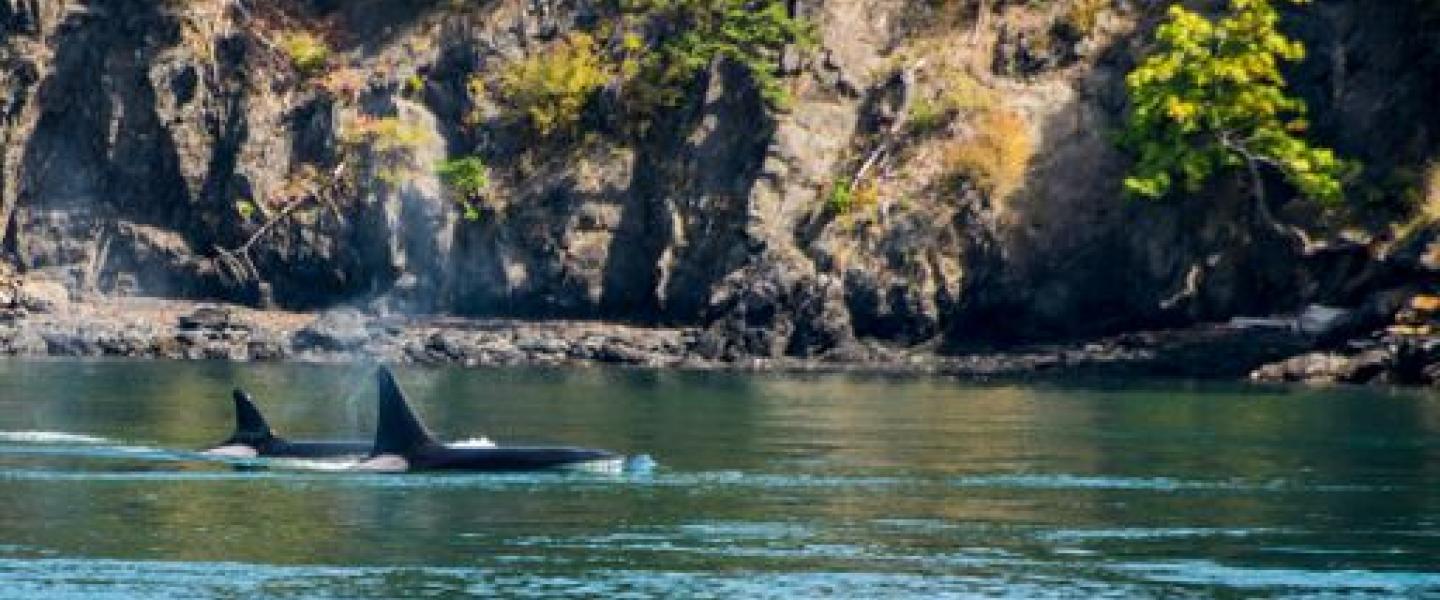 On this sunny Tuesday morning captains Gabe and Pete and I took a great group of folks out on the Kestrel, heading over to the Wasp Islands to try to locate a group of orcas who had been seen by a passing ferry. The group of Bigg’s killer whales were located and I identified them as the T101s, which are a really cool group of a mom, T101, who we think was born in 1973, and her three grown boys, T102, T101A, and T101B! The group of orcas were moving northwest in the direction of Spieden Island and we watched them surface again and again, traveling along, until suddenly they surfaced going the other direction, and quickly! They were on the hunt! Before we knew it there was blood in the water and it took only one minute before the seagulls swooped in to snag the parts of the harbor seal that the orcas were leaving behind. We got to see one of the males cartwheel underwater, throwing his tail in the air and then moonwalk, surfacing backwards, from fin to head; it was so cool!