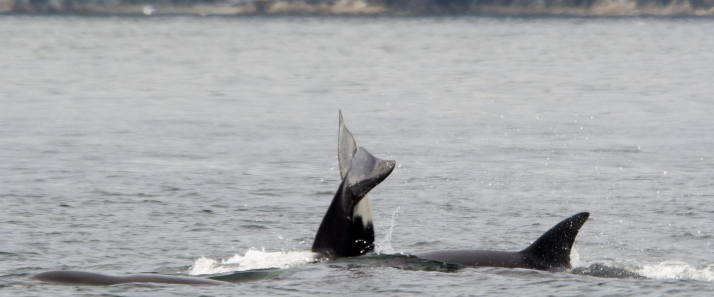 We were so lucky to find the T65As right away only a few minutes from the harbor. As we arrived, this beautiful family of orcas started to hunt! They submerged themselves underwater for minutes at a time as they scanned the surroundings for any seals. Then, suddenly, we see the whales surface, circling one area and exhibiting some speedy swimming while the baby whale showed us his tail in excitement.