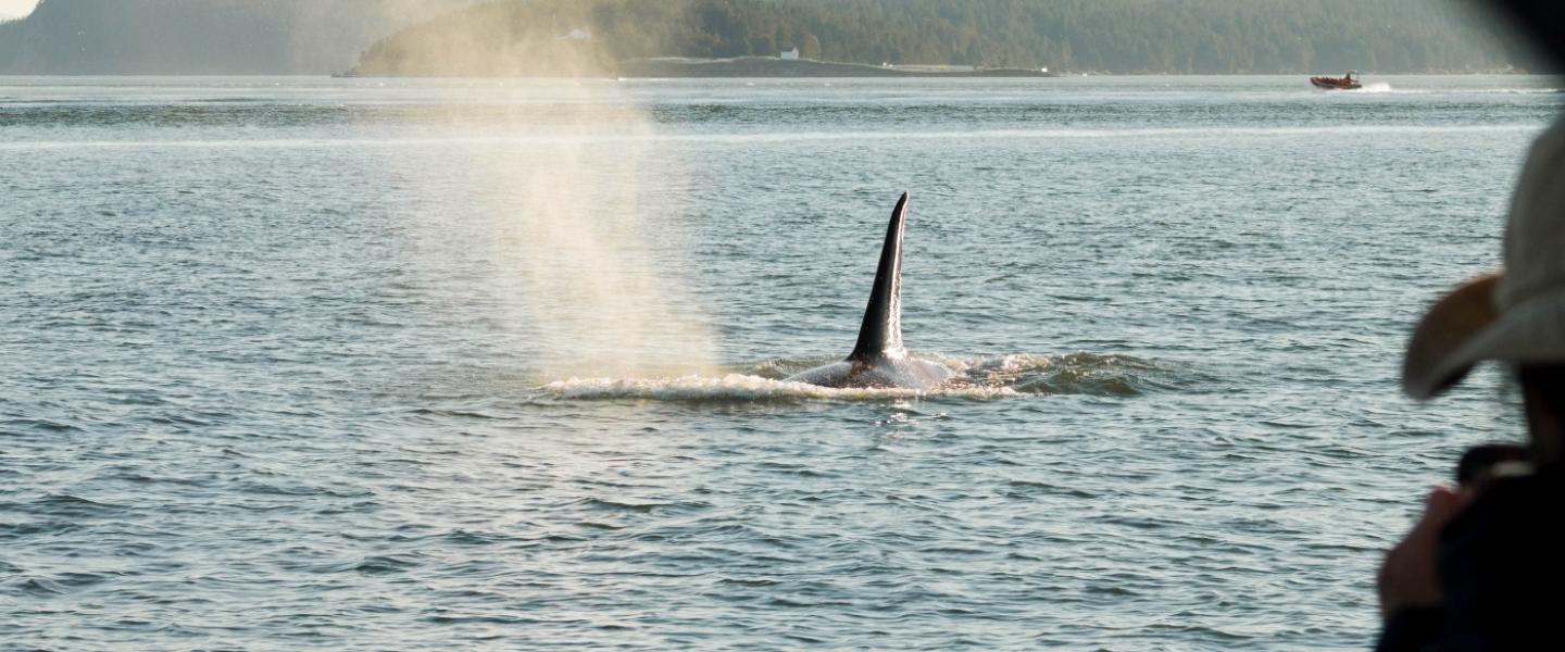 We continued our journey north in search of a large group of orcas traveling along the northern shores of Galliano Island. After we arrived in the Strait of Georgia, with the British Columbia Cascades stretching in front of us, we were greeted by a group of 10 whales moving quickly towards us. We oriented our boat alongside them, lining up parallel to their path of travel. We soon realized that we had two family groups present. One larger family, the T46B's, were in tight formation consistently surfacing off our left hand side. The second family group, the T101's, is a group of four consisting of one mom and her three massive adult sons, were more spread out, flanking the larger group and our boat on both sides. Mom and her oldest son were a little ways off our right hand side, but her two younger sons were far off our left hand side.