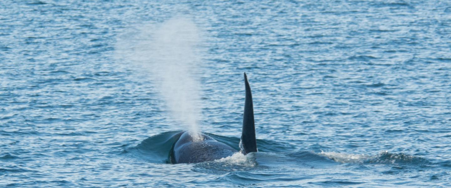 Eventually we decided to take a closer look at the two large males who were swimming close to the shore of Lopez Island. We ended up following the males up the entire west side of the island. They seemed to be exhibiting hunting behavior as they scanned the rocky crevices for any marine mammals. Within the Upright Channel, we suddenly found a sealion who surfaced just a few feet away from the males! All we know is that both the orcas and the sealion immediately disappeared under the dark water and didn’t surface for an extensive amount of time. The sealion was never seen again, so his fate remains a mystery. The males were identified as being T65A2 and T49A1, both of which are young adult males who have previously been spotted traveling and hunting together.
