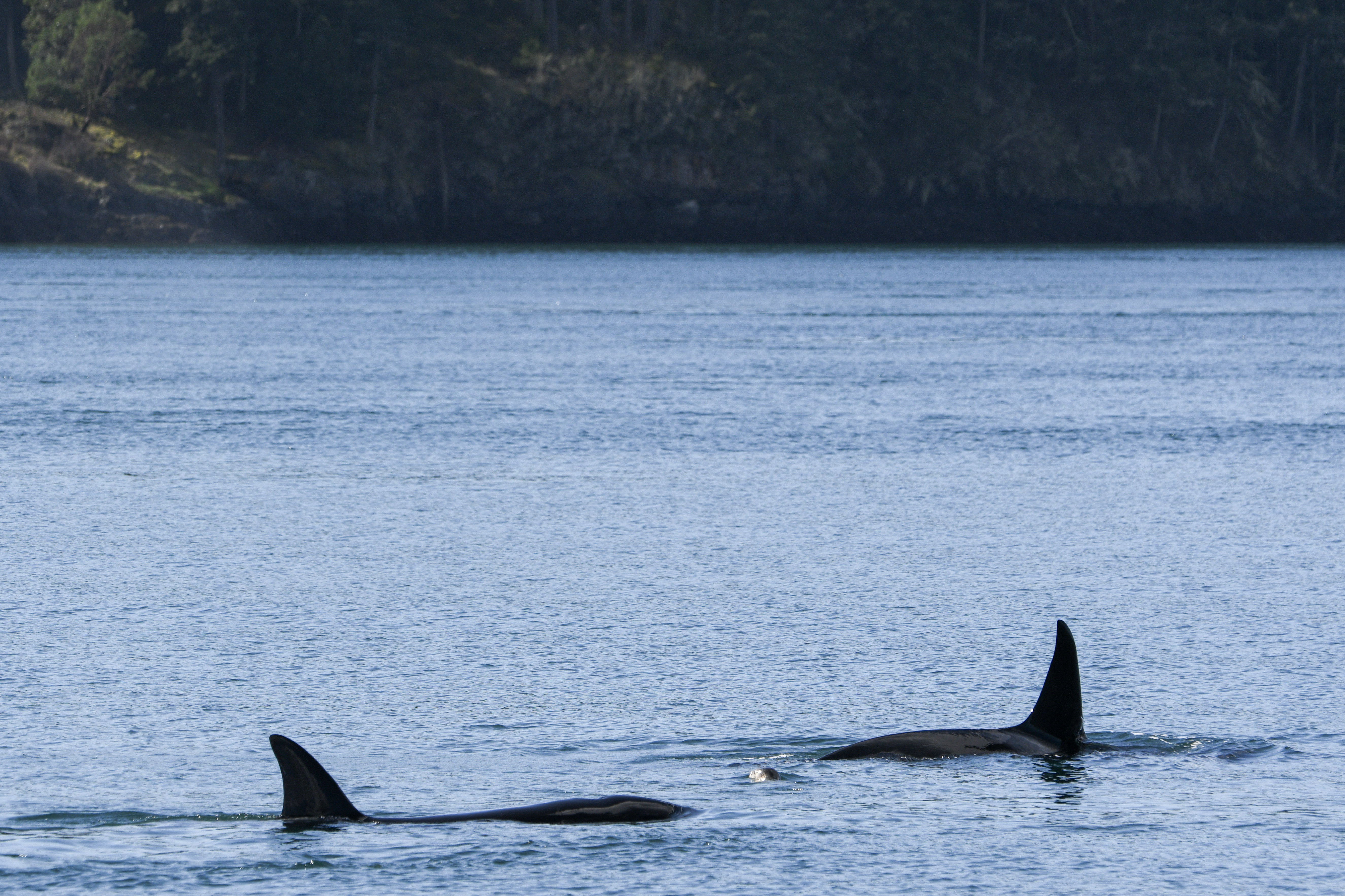 Slowly, T60C and F made their way across the channel, toward mom and their younger sibling. After a particularly long dive, we were surprised by the youngest whale Uncia (T60G) as she surfaced off our port side unexpectedly. We shut our engines off and watched as the 7 year old youngster contiguously surfaced in a circle, almost like she was investing something that had caught her interest. After 5 minutes of this circling behavior, suddenly mom surfaced! Mom followed suit and began to circle along with the baby of the family. We quickly realized what was happening when a harbor seal poked it's head out of the water directly between mom and daughter. Predation event? Playtime? Perhaps a bit of both. My best guess is that this was perhaps a teaching moment between mom and her youngest. Soon, the other two sibling appeared and joined the party. After all 4 went down on a long dive, they continued normal travel behavior and pointed north up San Juan channel. No sign of the harbor seal after...perhaps they finished the kill on the long dive? We do so much guessing out on the water as these apex hunters spend most of their life submerged. We only get a tiny glimpse into the mysterious lives they lead.