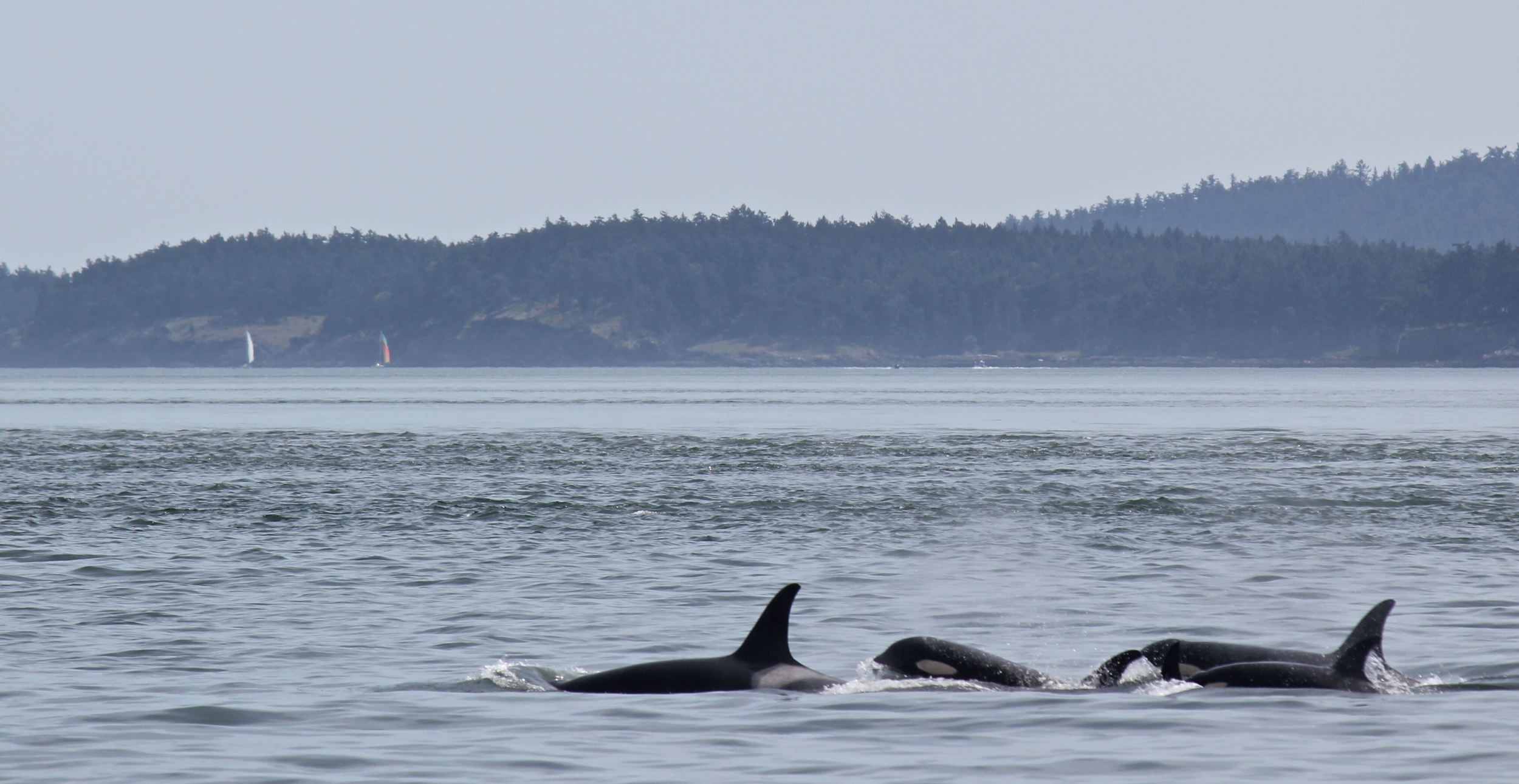 We rounded Cattle Point and headed north where everyone was thrilled to see a family of Bigg’s killer whales traveling near Lime Kiln lighthouse. The T124As made quite an impression on pedestrians surrounding Lime Kiln state park as they crossed the beautiful backdrop. Mom and calf stayed a little on the outskirts of the coastline as the rest of the family hugged the rocks as they moved north. If the family had an agenda of hunting in the area, this pair would have also reaped the benefits of any catch made today. Sharing prey is such an important bonding and familial experience for these killer whales, and as a newcomer the calf would not want to miss out on this opportunistic learning experience! It is always so exciting to see a calf on these whale-watching excursions, showing a healthy growing population of killer whales in the Salish Sea!