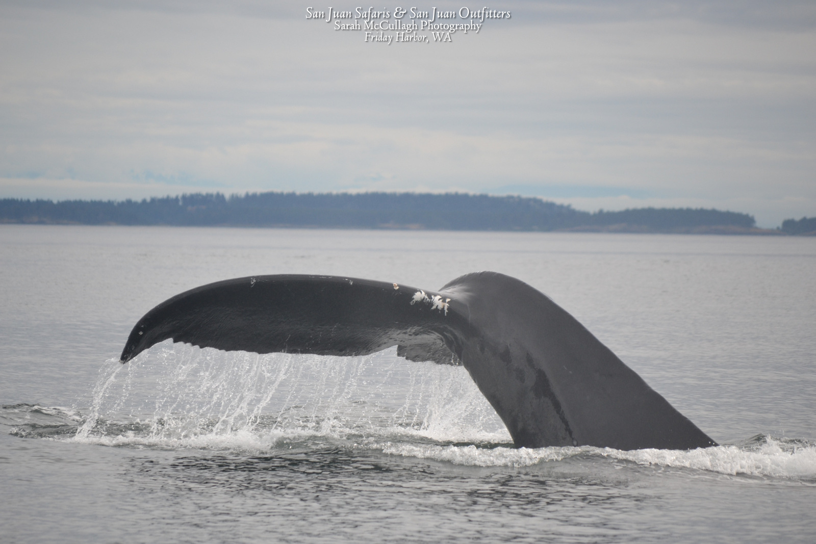 Then, we started to see a couple whale watching boats on the horizon. As we neared, we saw a distant blow and got so excited. We learned it was a humpback whale! In fact, as we caught great looks at his beautiful fluke, we learned it was a whale named Splitfin! He’s one of my personal favorite whales who has been visiting this area for years! He was swimming very erratically as we played a game of “eye spy” every time he surfaced. It seemed as if he was swimming in large circles around the strait as he potentially fed beneath the surface.